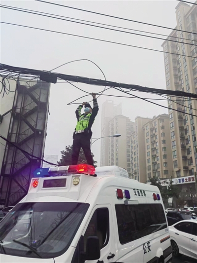 11月17日早高峰,合肥交警蜀山大队民警在巡逻至樊洼路时发现一处电线脱落,影响道路正常通行。为了确保车辆快速通过,交警一边通知相关部门,一边爬上执法车车顶,将电线暂时固定,撑起一条“绿色通道”。