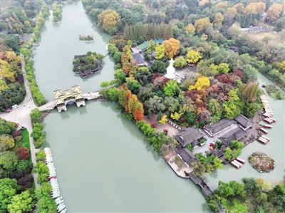 初冬时节,我国南方部分地区迎来彩叶观赏佳期,色彩斑斓的各色树叶美如画卷。图为11月19日拍摄的江苏扬州瘦西湖风景区初冬景色(无人机照片)。 新华社发 孟德龙/摄