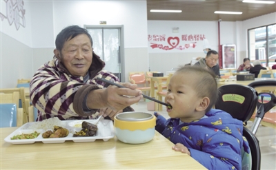 11月22日,合肥市肥东县老年助餐服务中心内,老人邹帮友(左)带着孙子就餐。 近日,在做好疫情防控的前提下,肥东县首个养老中央厨房——肥东县老年助餐服务中心在该县店埠镇正式运行。该养老中央厨房不仅可以为前来堂食的老人们提供平价套餐,还可以为店埠镇21个社区老年助餐点以及周边的1400余位老人提供送餐服务。据悉,肥东县近年来发展县域养老、助老公共服务,目前共建成24个老年食堂以及75个老年助餐点。