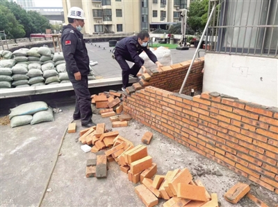 接到举报后,七里塘城管中队执法队员前往现场核查发现,该小区楼栋的二楼平台区域有三名施工人员正熟练地砌着砖墙,旁边堆放着尚未来得及使用的红砖和若干处搅拌好的混凝土。
