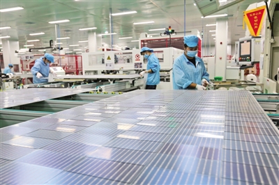 近年来,安徽省淮北市烈山区借助长三角一体化发展契机,积极建设产业承接平台,通过建设智能工厂,加大科技创新投入,引进光伏新能源企业入驻,促进光伏产业快速发展,助力区域经济转型升级。目前,当地生产的光伏面板产品除销往国内市场外,还出口日本、荷兰、西班牙、澳大利亚等国家。图为11月24日,在淮北市烈山经济开发区一家光伏面板生产企业车间,工人在生产线上忙碌。