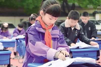 一年级和辅读班的比赛项目是穿衣服。活动现场,孩子们一“拎”、一“搭”、一“套”、一“拉”,最后理一理衣领,平一平褶皱,精神面貌立刻焕然一新。二年级的比赛项目是叠衣服。孩子们胸有成竹,稚嫩的小手灵活地控制着衣服的一条边,将其迅速对折,随后是另一条边……整个过程信手拈来。