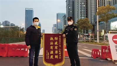 “可能是孩子病情确实不轻,男子比较激动,其他工作人员的话他听不进去,我立即对他进行了情绪疏导,说明了后果和风险,后来他也意识到自己行为的不妥,今天孩子情况好转,也借警察向我们表达了谢意。”倪勇表示。“防疫有原则 执法有温度”,6日晚,该幼儿父母向倪勇送来了锦旗表示感谢。