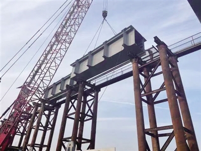 日前,随着重达30吨的钢箱梁精准安全稳定地放置在系梁临时支架上,引江济淮工程引江济巢段03标沐集大桥项目首榀钢箱梁成功架设,揭开了主桥上部结构施工序幕,标志着本项目主桥上部结构施工驶入”快车道”。