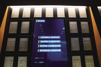 在展厅的玻璃柜内陈列着一页页泛黄的名簿,封面上用日语写着“关东军防疫给水部留守名簿”,多媒体展示屏上,部队成员的签名、人员来源、身份构成、职级、亲友信息、印章等清晰可见。