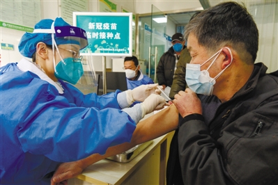 2022年12月21日,在安徽省合肥市庐阳区林店街道社区卫生服务中心,老年人正在接种新冠病毒第二剂次加强免疫针(第四针)。据悉,该街道积极推进辖区老年群体新冠疫苗接种工作,通过加大疫苗供应保障,线上线下开展接种疫苗科普宣传,为老年人开辟绿色接种通道,并为腿脚不便老年人提供上门接种等多种形式,推进老年群体疫苗接种覆盖面,筑牢健康安全屏障。