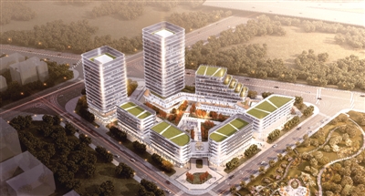 该项目设计重点突出“一心、一环、一轴”规划结构。“一心”即以内部庭院为绿色景观核心,打造内部公园景观。“一环”是以裙房串连高层并围合庭院,打造连续城市界面。“一轴”为通过内部景观铺装以及建筑围合空间形成南北景观主轴。