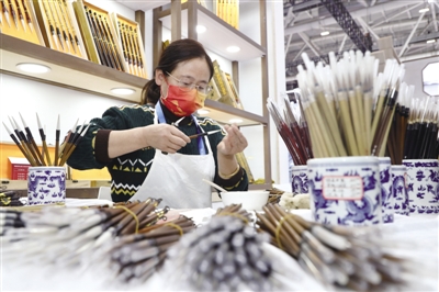 文创精品板块则展示阜阳剪纸、柳编制品,芜湖铁画摆件,宣城宣纸、宣笔、徽墨,铜陵铜艺术品、黄山歙砚、徽州三雕,淮北大运河文创系列叶纹碗、蹴鞠等徽文化、淮河文化、皖江文化地域文创产品。