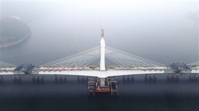 当日,中国铁建大桥局池(州)黄(山)铁路太平湖特大桥顺利合龙,为池黄铁路2023年全线铺轨奠定了基础。太平湖特大桥是池黄铁路全线控制性工程,全长926.1米,其中主桥长788米,采用双线三塔矮塔斜拉桥,两个主跨均为228米。池黄铁路全长约125公里,设计时速350公里。新华社记者 刘军喜/摄