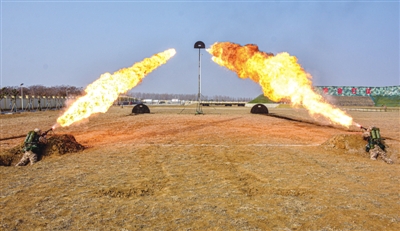 1月3日,武警安徽总队机动支队组织防化分队官兵开展喷火训练。