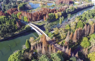 近期,云南省昆明市海洪湿地公园的水杉迎来观赏季,吸引不少游客前来游览。昆明海洪湿地公园位于滇池北岸、盘龙江入湖口西侧,是滇池的一道湖滨生态屏障。图为日前拍摄的海洪湿地公园(无人机照片)。新华社记者 陈欣波/摄