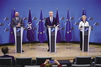当天上午,北约秘书长斯托尔滕贝格、欧洲理事会主席米歇尔和欧盟委员会主席冯德莱恩在北约总部共同出席了宣言签字仪式。