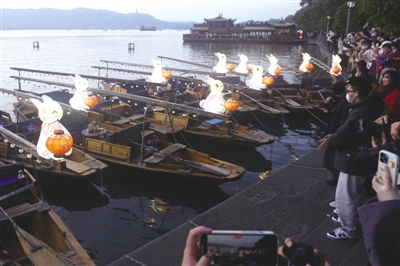 随着农历癸卯兔年临近,日前,30艘装有“玉兔灯”的手划船集中亮相杭州西湖,供市民游客乘坐、赏灯游玩,热热闹闹迎接新春佳节。图为1月11日,市民游客在杭州西湖边观赏“玉兔灯”。新华社发 龙巍/摄