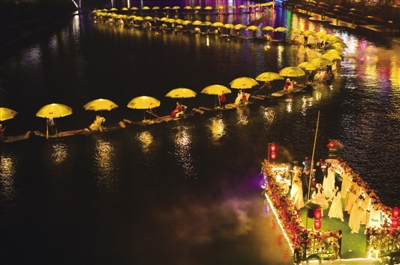 1月14日,在湖北省恩施土家族苗族自治州宣恩县贡水河上,一场“贡水游龙”迎新春活动吸引不少市民游客参与体验。“贡水游龙”由数十条竹筏作“龙身”,辅以灯光、音乐,人们可以在贡水河上“乘龙”观赏璀璨夜景,欢乐迎新春。图为人们在体验“贡水游龙”。 新华社发 宋文/摄
