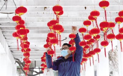 日前,合肥市蜀山区园林绿化管理中心工作人员在环城公园西山景区悬挂灯笼。春节将至,在蜀山区各大公园和街边,已陆续挂起了喜庆的大红灯笼,营造了喜庆祥和的节日氛围。
