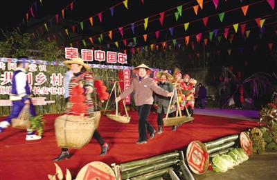 1月17日晚,广西柳州市柳江区进德镇乐山村长安屯“我们的村晚”活动在该屯广场上热闹开演。由乡镇志愿者、村民自编自导自演的节目轮番登场,热热闹闹迎接新春佳节的到来。图为村民扛着农具在“村晚”活动上走秀。 新华社发 黎寒池/摄