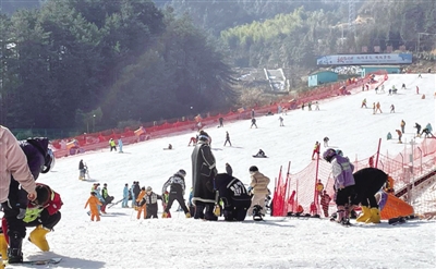 7岁的江乐辰在教练的搀扶下,第一次踉跄踏上了儿童滑雪练习道。在天柱山滑雪场,江乐辰的母亲告诉记者,他们一家从上海来,在这里迎接了兔年新春。安徽省安庆市潜山市抓住国家冰雪运动“北雪南展”战略机遇,2017年通过招商引资建设了天柱山滑雪场,发展冰雪旅游,助力乡村振兴。位于潜山市水吼镇和平村的天柱山滑雪场,地处大别山腹地。春节期间,游客在领取雪鞋、雪服的柜台前排起长队,不少矫健的身影正在三条雪道上飞驰,雪场十分热闹。