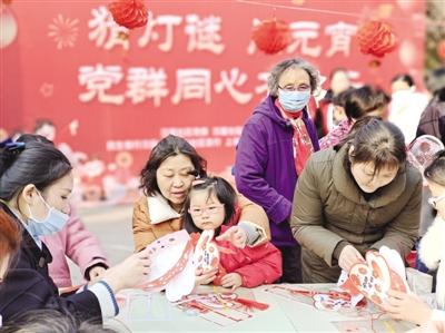 兔年春节刚刚过去,正月十五奔踏而至。 近日,合肥市西园街道汉嘉社区党委组织开展“猜灯谜闹元宵,党群同心齐欢乐”主题党日活动,居民们欢聚一堂,猜灯谜、做花灯,热热闹闹庆元宵。 程甜甜 孙雨静 记者 马冰璐 文/图