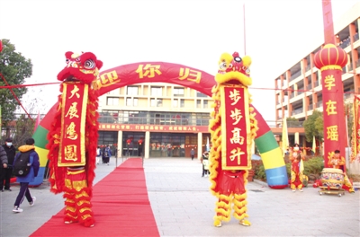 昨天早上七点半,伴随着欢乐、喜庆的锣鼓声,两只霸气威武、炫彩夺目的狮子欢欣起舞,迎接孩子们重返校园。同学们将亲手制作的灯笼高高挂起。校园