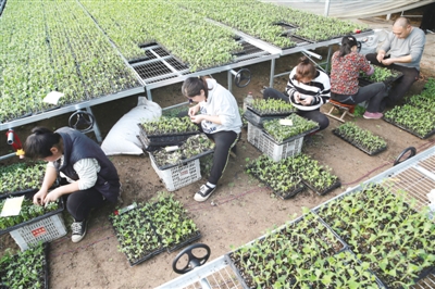 早春时节,各地抢抓农时,开展备种备耕工作。图为2月8日,农民在安徽省淮北市濉溪县五铺村育苗基地的大棚内嫁接西瓜苗。