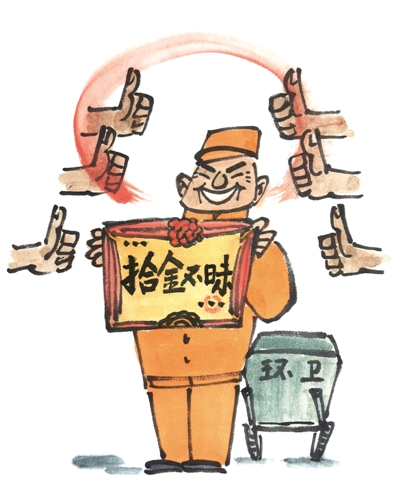 52岁的安徽人年师傅,在杭州三十多年了。去年,年师傅到杭州拱墅区景翠公寓小区当垃圾清运员,到现在刚好满一年。2月4日,年师傅在小区做垃圾分类时,捡到一个信封,里面是一叠整整一万元的现金,他报了警,物归原主。失主要给感谢费,他谢绝了,却主动要失主给他颁发一张奖状。(2月12号《华商报》)