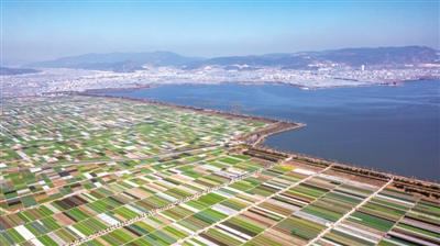 早春时节,云南省玉溪市通海县田园风光秀美。五彩斑斓的农田与湖水、山峦交相辉映,构成了一幅美丽的画卷。图为云南省玉溪市通海县的田园风光(无人机照片)。 新华社记者 胡超/摄