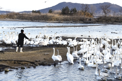 初春时节,山东荣成市大天鹅国家级自然保护区增加了对来此越冬栖息大天鹅投喂食物的频率和数量,给这些“美丽精灵”即将进行的迁徙补充能量、储备体力。图为荣成市大天鹅国家级自然保护区工作人员给大天鹅投放食物(2月14日摄)。 新华社记者 李紫恒/摄