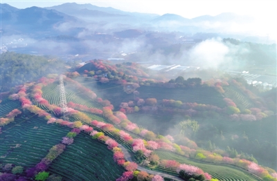 近日,福建省漳平市永福镇台品樱花茶园里的樱花迎来最佳赏花期,吸引众多游客观赏。图为位于漳平市永福镇的台品樱花茶园里云雾缭绕,樱花盛开(无人机照片)。 新华社记者 魏培全/摄