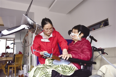 从不能行走到说话含糊不清,接着是肌肉萎缩,全身瘫痪,靠着呼吸机、鼻胃管维持生命,口不能言、手不能动,这一切,让庞华琴感到恐惧、绝望。于是,庞华琴就在网上查看关于渐冻症的资料,加上和一些渐冻症患者的交流,病友给予她精神上的支持,最后庞华琴学会了淡然。