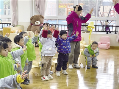 “小朋友们看这里,大家一起跳跳跳!”2月13日上午,蚌埠市蚌山区龙湖幼儿园教育集团吾悦分园的老师们正带领着孩子们做游戏。记者跟随采访团来到吾悦分园了解该园的托幼服务课程开展情况。