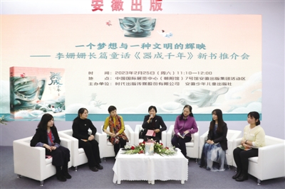 安徽少年儿童出版社精心策划、重磅推出的儿童文学作家李姗姗长篇童话《器成千年》于今年1月出版后引起广泛关注。2月25日上午,在第35届北京图书订货会期间,时代出版传媒股份有限公司、安徽少年儿童出版社主办的“一个梦想与一种文明的辉映:李姗姗长篇童话《器成千年》新书推介会”举办,深入探讨本书的创作与出版价值。