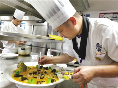 “蜀山蚕韵”引得多位选手来拍照,以煮熟的虾仁为馅,外裹以切碎的威化纸,一个个蚕宝宝卧于桑叶。该作品出自高级技师方明远之手,“以前蜀山农村种桑养蚕,通过这道菜展示蜀山的发展。”徽菜师傅方明远告诉记者,本次“新徽菜·名徽厨”专项职业技能竞赛对厨师来说,是一个激励,让厨师们对徽菜内涵有了新了解,对以后的发展更有信心。