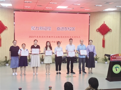 仪式上,倪娜主任详细介绍了7位轮岗的优秀中青年教师的基本情况,他们或是所在学科的省市区级学科带头人和骨干教师,或是瑶海区引进高端人才。合肥市大通路小学教育集团校长沈立珍和东校区执行校长、合肥市大通路小学教育集团副校长谢后荣为轮岗到东校区的老师颁发荣誉证书。之后,轮岗教师代表张鹏程和尚雪婷发言,他们表示将积极响应集团发展的需要, 并把交流轮岗作为一项荣誉,作为一次锻炼的机会,打破自己熟悉的圈子,沉下身子熟悉东校区的工作环境,迅速投入到教育教学工作中去,争取有新的成长。