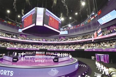 9月26日,杭州亚运会电子竞技项目王者荣耀亚运版本决赛中,中国选手、来自安徽的蒋涛与队友携手以2∶0战胜马来西亚队夺冠,赢得亚运会电子竞技首金!图为颁奖仪式现场。