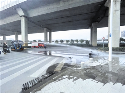 在完成灭火任务后,洒水车又无缝转入环境恢复工作。洒水车驾驶员与紧急调集的4名环卫工人默契配合,先以洒水车冲洗路面残留物,再人工细致清理焦痕。经过紧急处置,事发路段已恢复整洁畅通。