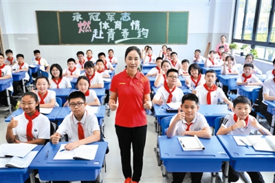 星报讯 9月1日上午,合肥市五十中学天鹅湖教育集团天鹅湖校区(奥体分部)“承冠军志 燃体育情 赴青春约”开学典礼举办,2000年悉尼奥运会女子20公里竞走冠军,北京体育大学田径学院竞走国家级教练王丽萍受聘担任合肥市五十中天鹅湖教育集团体育校长,并走进班级给同学们带来了“开学第一课”。