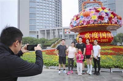 10月1日,合肥市政务中心南广场上,一些市民来到“欢度国庆”大花篮前拍照留念。