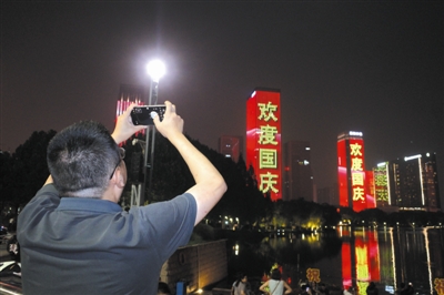 10月6日中秋夜,合肥市天鹅湖周边的红色氛围灯光秀点亮夜空,激光投射出的“欢度国庆”等字样祝福祖国繁荣昌盛,吸引了众多市民前来观赏拍照。
