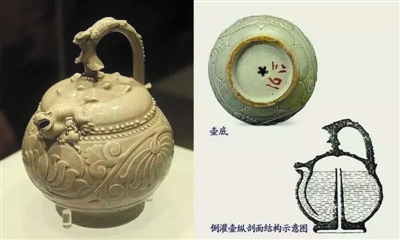 这件魔壶就是“青釉提梁倒注瓷壶”,是唐代青瓷中的佼佼者,属于“耀州窑”的产品。耀州窑是我国古代北方著名的八大名窑之一,它始于唐,兴于宋,衰落于明,以生产工艺精湛的刻花青瓷驰名中外。而这件在墙角被挖出来的文物之所以被称作“魔壶”,因为它是一件底部有洞却不漏酒的神奇酒壶。