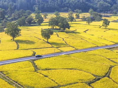 近日,安徽省黄山市黟县宏村镇塔川连片的稻田渐黄,层层叠叠,秋风吹过夹着稻香,美不胜收。