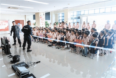 在审判大楼前,该院司法警察大队的法警们向孩子们展示了擒敌拳、队列等。小朋友们伸长脖子、睁大眼睛、竖起耳朵,好奇地盯着警察叔叔阿姨,响亮的口号,整齐划一的动作博得了萌娃们的阵阵掌声和欢呼,萌娃们直呼“好帅!”在警用装备展示区,法警们逐一介绍法警训练器械、单警装备、防暴器材、高科技司法警务装备的功能和使用方法,并现场展示了法院安检流程,法警通过模拟违禁物品排查,向师生科普诉讼参与人安检规范,进一步提升其法治意识。随后在该院讲解员的带领下,孩子们参观了诉讼服务大厅、审判法庭和羁押室等场地,近距离感受了法院文化和审判执行工作流程。