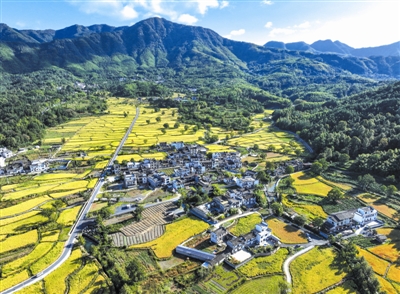 金秋时节,安徽省黄山市黟县宏村镇塔川国家森林公园内稻浪翻滚,金黄稻田与粉墙黛瓦构成一幅丰收与古韵交织的秋日画卷。图为10月16日拍摄的塔川国家森林公园美景。