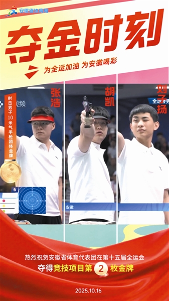星报讯 10月16日,在广东省黄村体育训练中心进行的第十五届全国运动会男子10米气手枪团体金牌赛中,由胡凯、刘子扬、张浩组成的安徽队以16:6战胜由胡鹏琦、路世昌、牛琪松组成的河北队,夺得冠军,为安徽省体育代表团夺得本届全运会射击项目首枚金牌,也是安徽竞技体育项目的第二枚金牌。