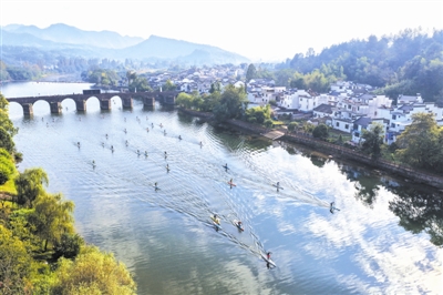 2025年10月25日,安徽省黄山市休宁县齐云山横江水域,参赛选手正挥桨竞逐。