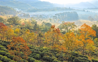 11月2日,安徽省黄山市黟县塔川国家森林公园秋意渐浓,乌桕、枫香等树木披上红、黄、橙交织的彩衣,与点缀其间的白墙黛瓦共同构成一幅绚烂的秋日画卷。