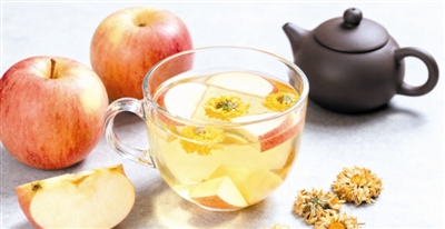 做法:取苹果1个切小块,放6-8朵菊花,加水煮。
