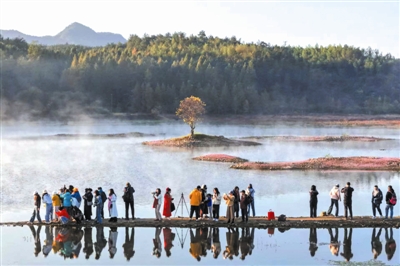 日前,安徽省黄山市黟县宏村镇奇墅湖水雾蒸腾,鎏金般的霞光洒满湖面,熠熠生辉,游客徜徉其间,宛如置身仙境,流连忘返。