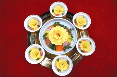 “牡丹燕菜”的制作,堪称烹饪技艺的极致展现。普通的白萝卜需经过切丝、裹淀粉、蒸制、高汤煨炖等十余道工序,方能蜕变为口感酷似燕窝的佳肴。老师傅手下的萝卜丝细可穿针,经清水反复漂洗去除辛辣,再裹粉蒸至半透明,最后在顶汤中慢煨入味。成菜时,以蛋皮丝、火腿丝在汤面拼出牡丹花形,寓意“花开富贵”。