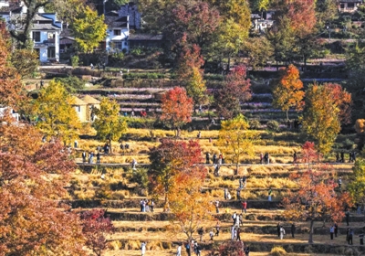 近日,安徽省黄山市黟县宏村镇塔川国家森林公园秋色绚丽,进入最佳观赏期。层林尽染的秋叶与粉墙黛瓦的古村落相互映衬,金色的稻田点缀其间,构成一幅诗意盎然的秋日画卷,吸引众多游客前来赏秋游览。