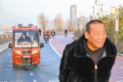 11月26日下午,在位于蚌埠市禹会区的淮河南岸河堤上,61岁的刘德才肩挎两根磨得发亮的背绳,弓腰牵引着一辆红色三轮车稳步前行。车上,百岁高龄的父亲刘振玉倚靠在厚棉垫上晒着太阳,安详地闭目养神。车旁,两只小狗欢快地跑前跑后,为这段温情旅程增添了几分生趣。这动人的一幕,已在淮河岸边延续了四个春秋。